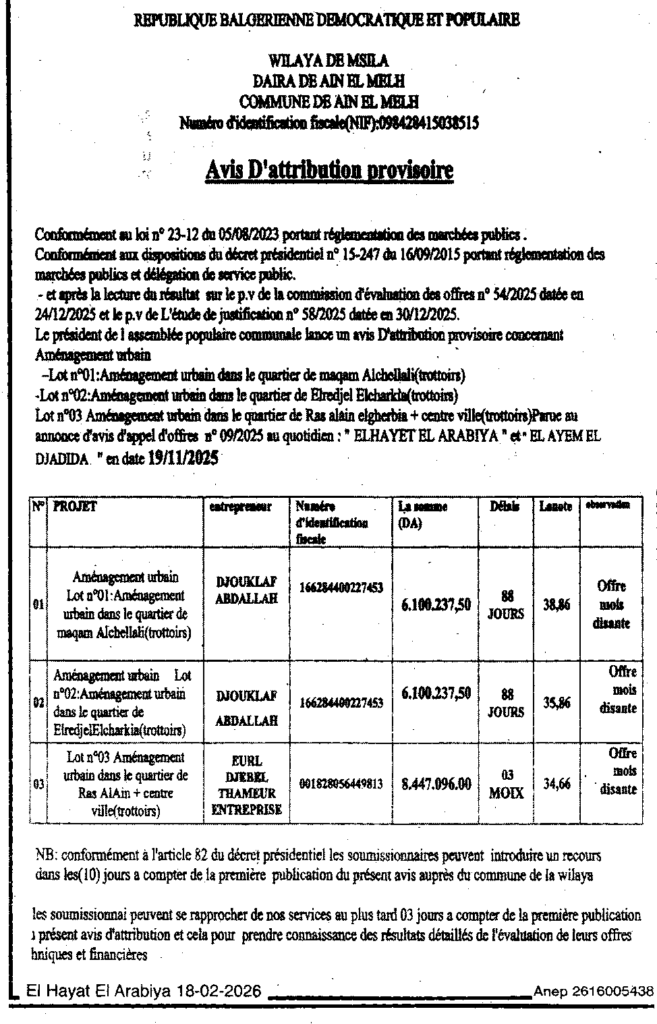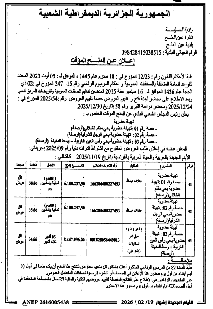 إعلان عن منح مؤقت تهيئة حضرية/ بلدية عين الملح
