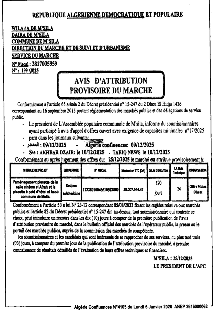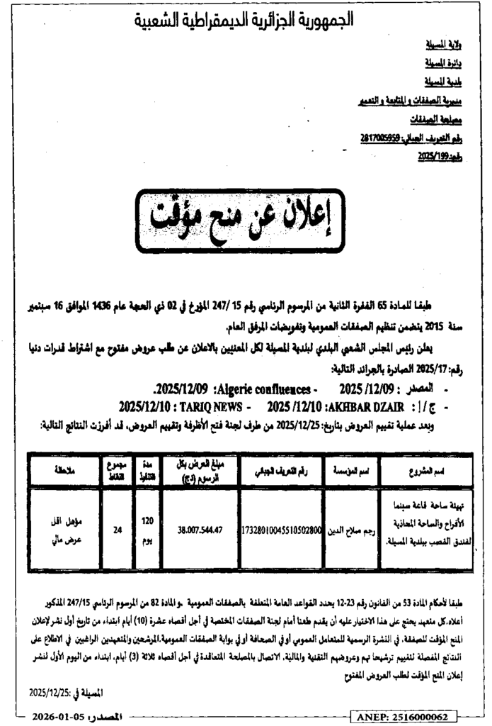 إعلان عن منح مؤقت تهيئة ساحة قاعة سينما الأفراح/ بلدية المسيلة