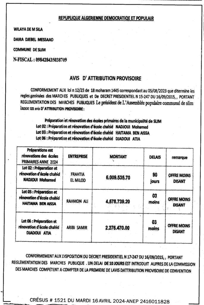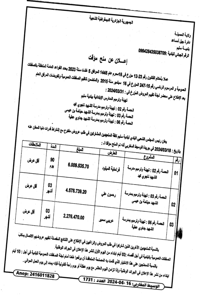 إعلان عن منح مؤقت: تهيئة وترميم المدارس الابتدائية ببلدية سليم