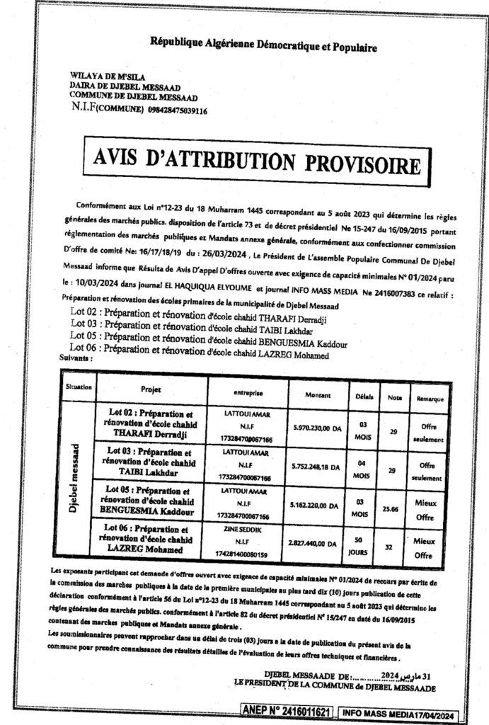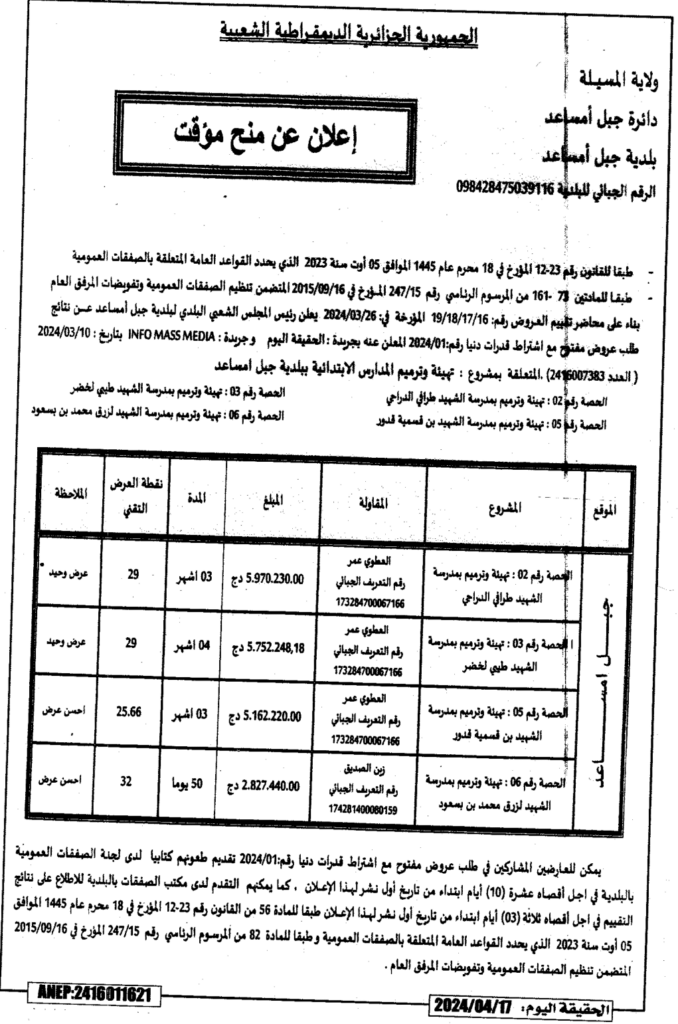 إعلان عن منح مؤقت: تهيئة وترميم المدارس الابتدائية ببلدية جبل امساعد
