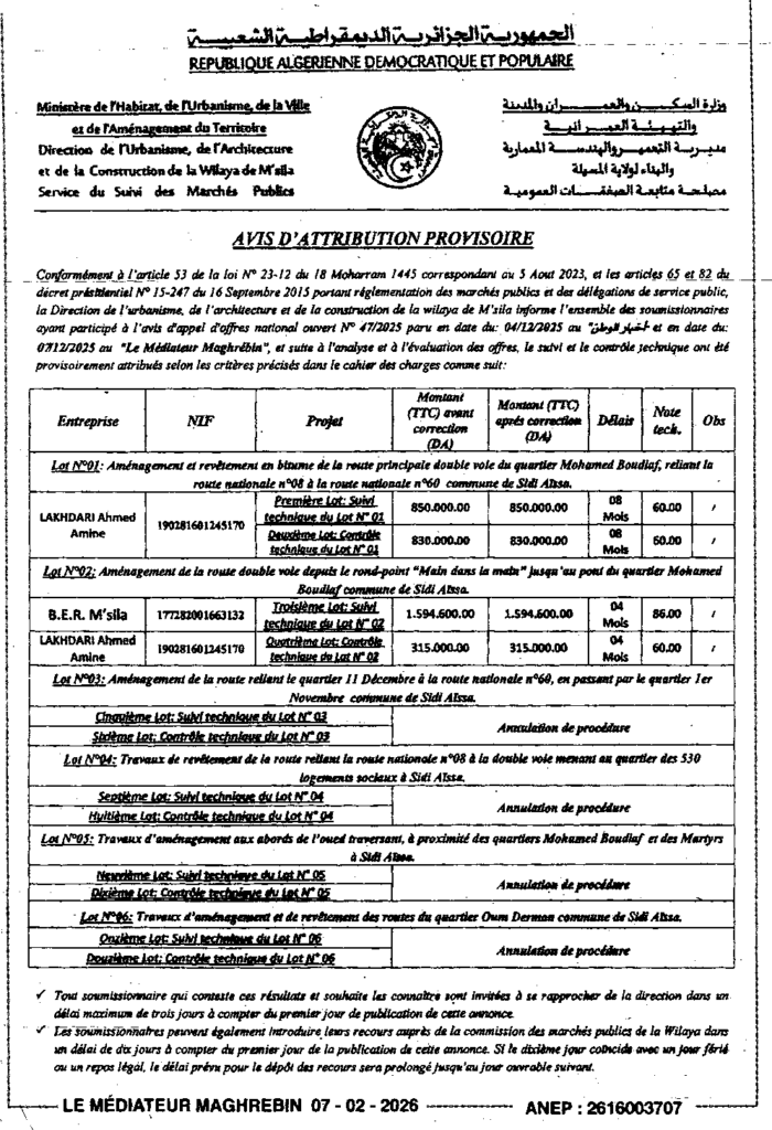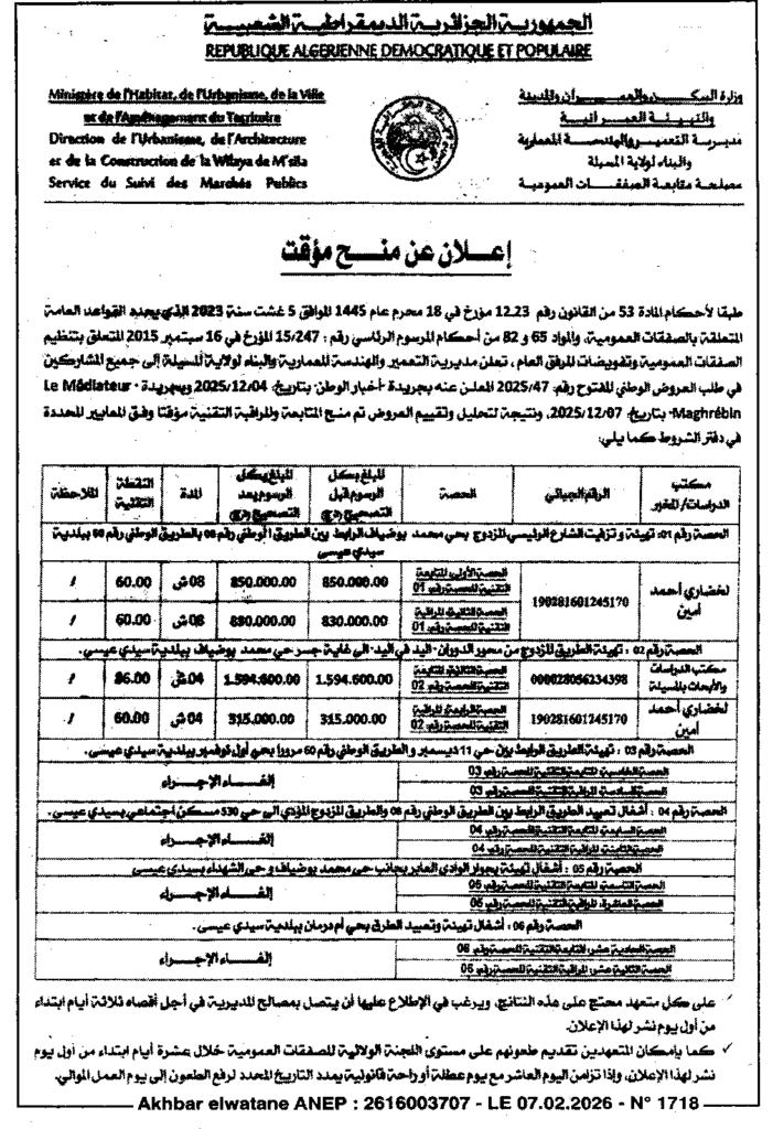 إعلان عن منح مؤقت تهيئة وتزفيت الشارع الرئيسي المزدوج ببلدية سيدي عيسى/ مديرية التعمير والهندسة المعمارية والبناء لولاي المسيلة