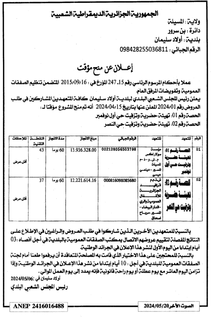 إعلان عن منح مؤقت تهية حضرية وتزفيت أحياء بلدية أولاد سليمان