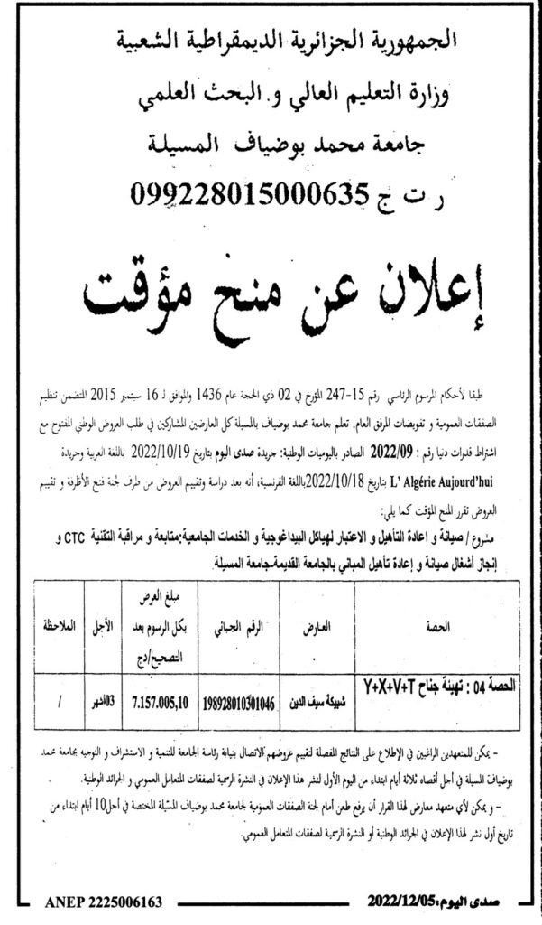 إعلان عن منح مؤقت/ جامعة محمد بوضياف بالمسيلة