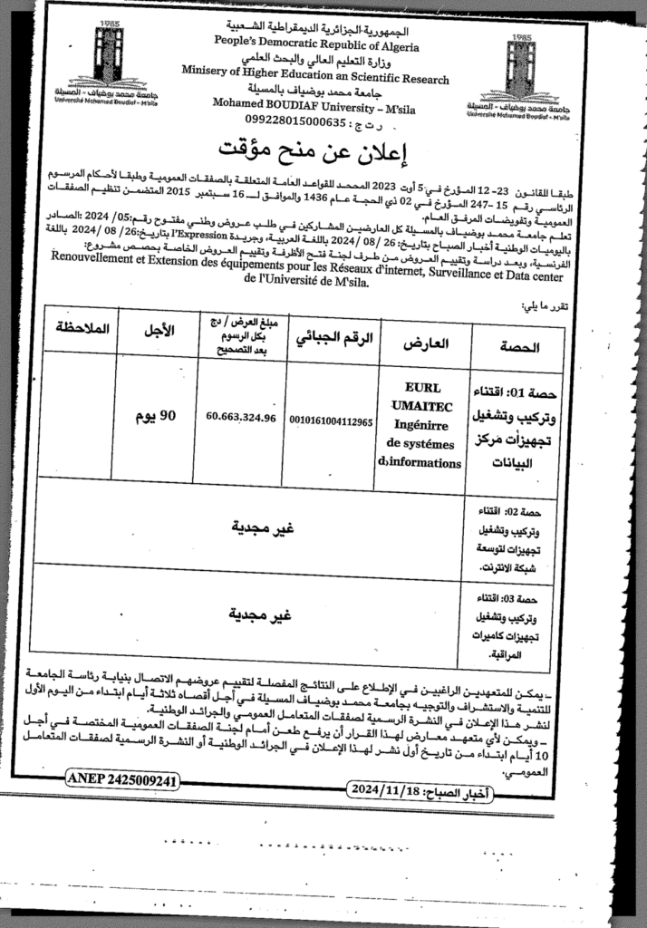 إعلان عن منح مؤقت/ جامعة محمد بوضياف بالمسيلة