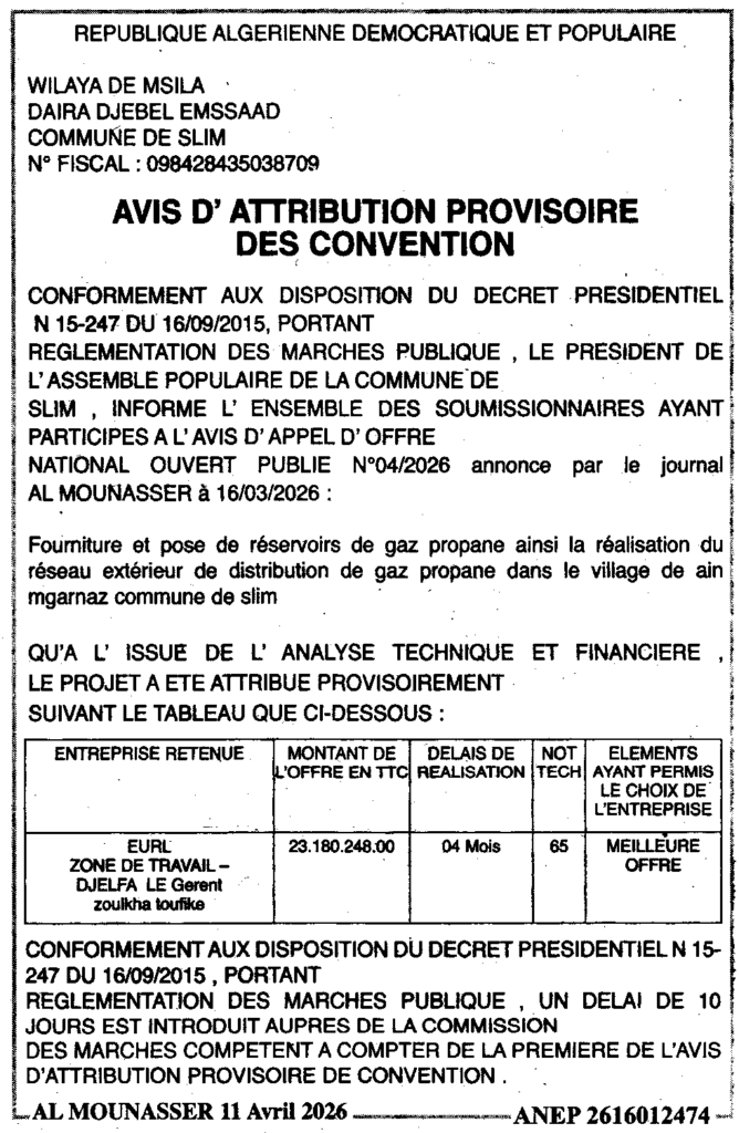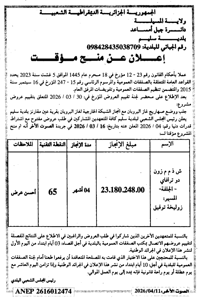 إعلان عن منح مؤقت جلب ووضع صهاريج غاز البروبان مع انجاز الشبكة الخارجية/ بلدية سليم