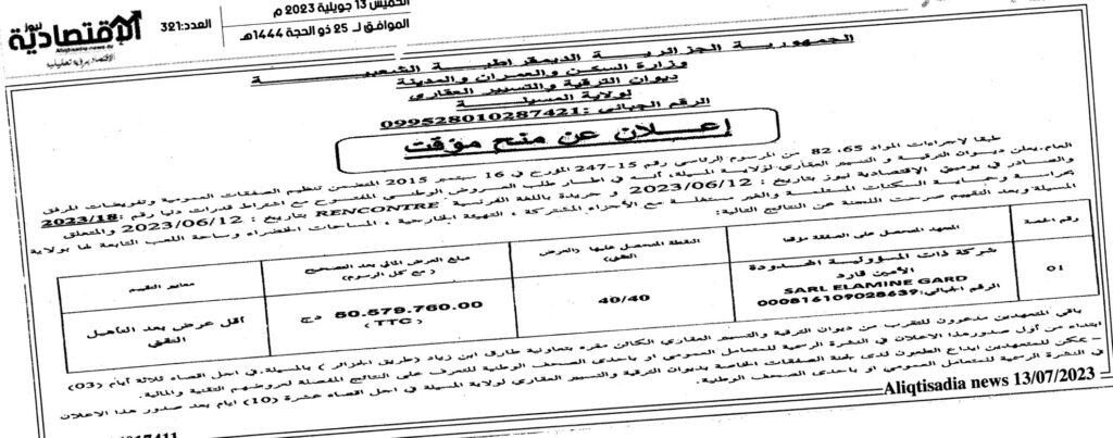 إعلان عن منح مؤقت: حراسة وحماية السكنات المستعملة والغير المستغلة مع الأجراء المشتركة/ ديوان الترقية والتسيير العقاري لولاية المسيلة