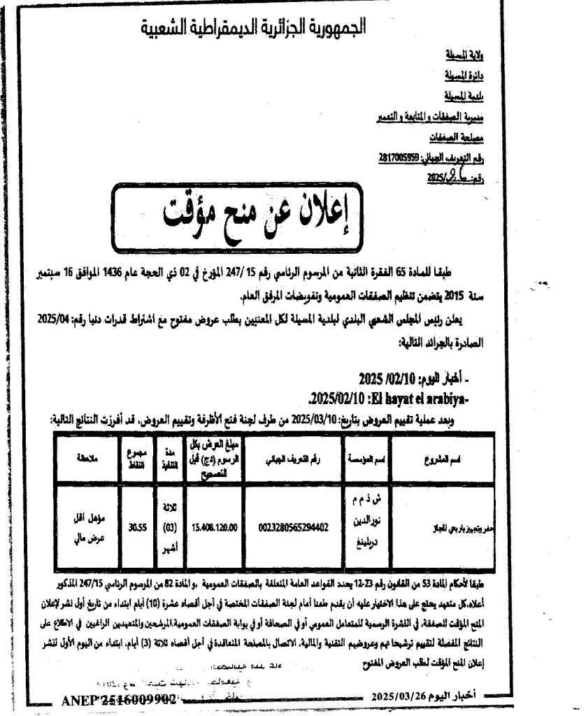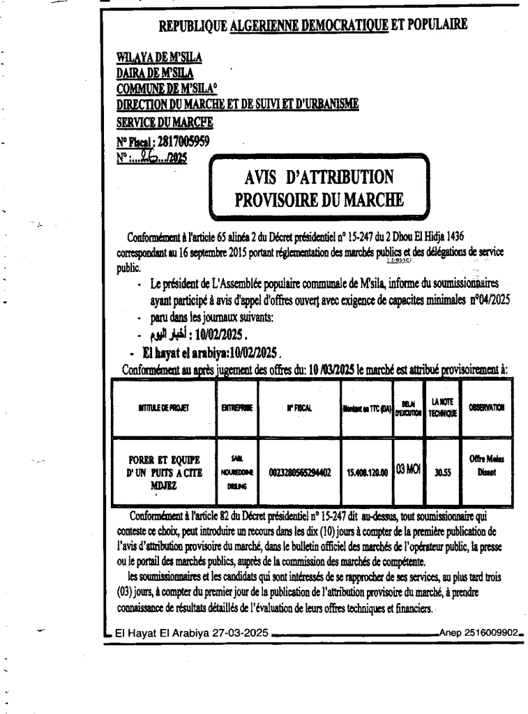 إعلان عن منح مؤقت حفر وتجهيز بئر بحي المجاز/ بلدية المسيلة
