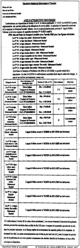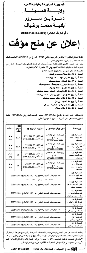 إعلان عن منح مؤقت خدمات النقل المدرسي لسنة 2026/ بلدية محمد بوضياف