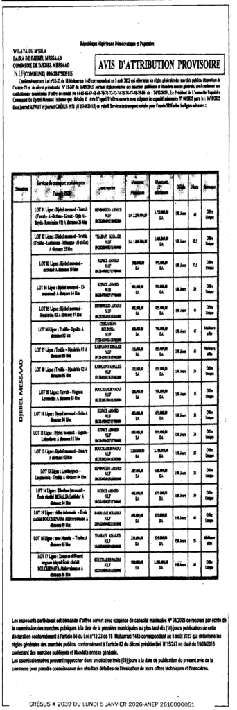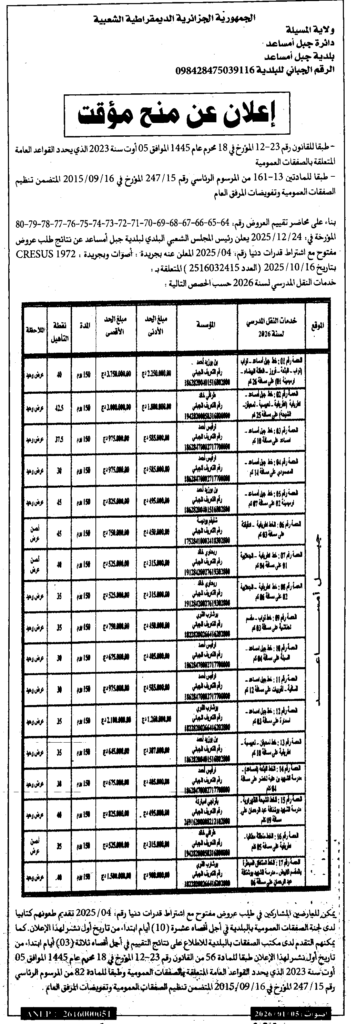 إعلان عن منح مؤقت خدمات النقل المدرسي 2026/ بلدية جبل امساعد