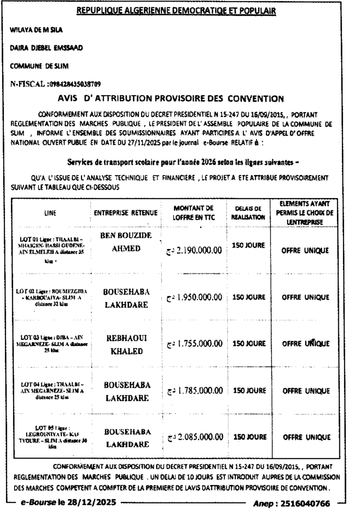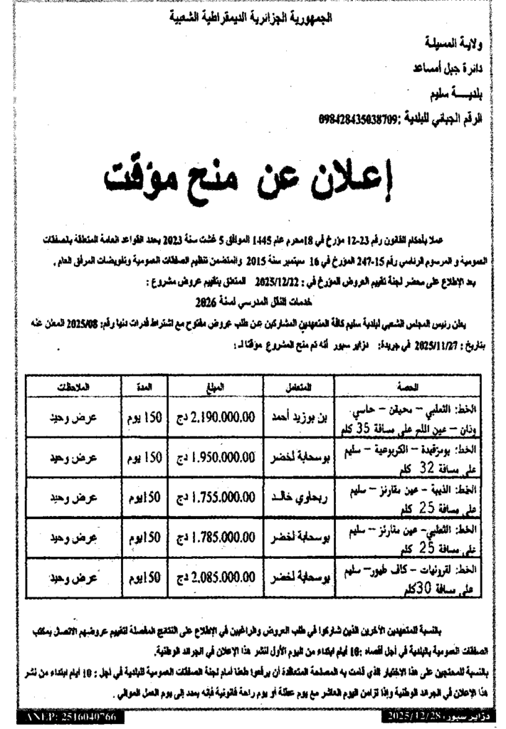 إعلان عن منح مؤقت خدمات النقل المدرسي 2026/ بلدية سليم