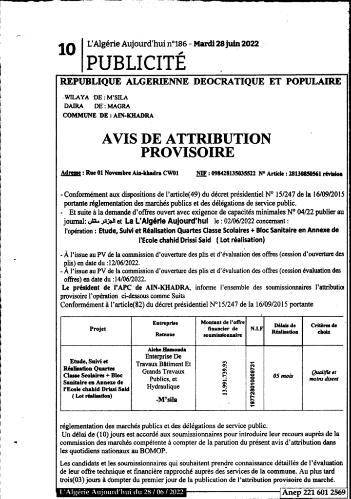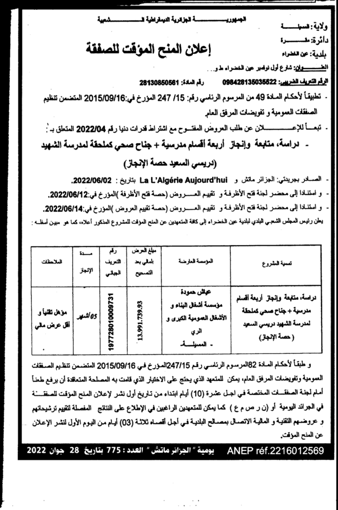 إعلان عن منح مؤقت: دراسة، متابعة وانجاز أربعة أقسام مدرسية + جناح صحي كملحقة لمدرسة الشهيد (دريسي السعيد حصة الإنجاز) بلدية عين الخضراء