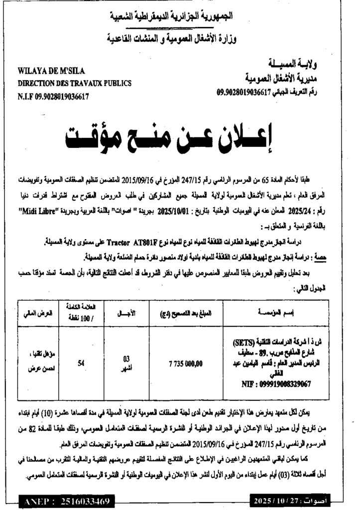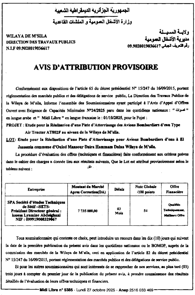 إعلان عن منح مؤقت دراسة انجاز مدرج لهبوط الطائرات القاذفة للمياه نوع Tractor AT801F/ مديرية الأشغال العمومية لولاية المسيلة