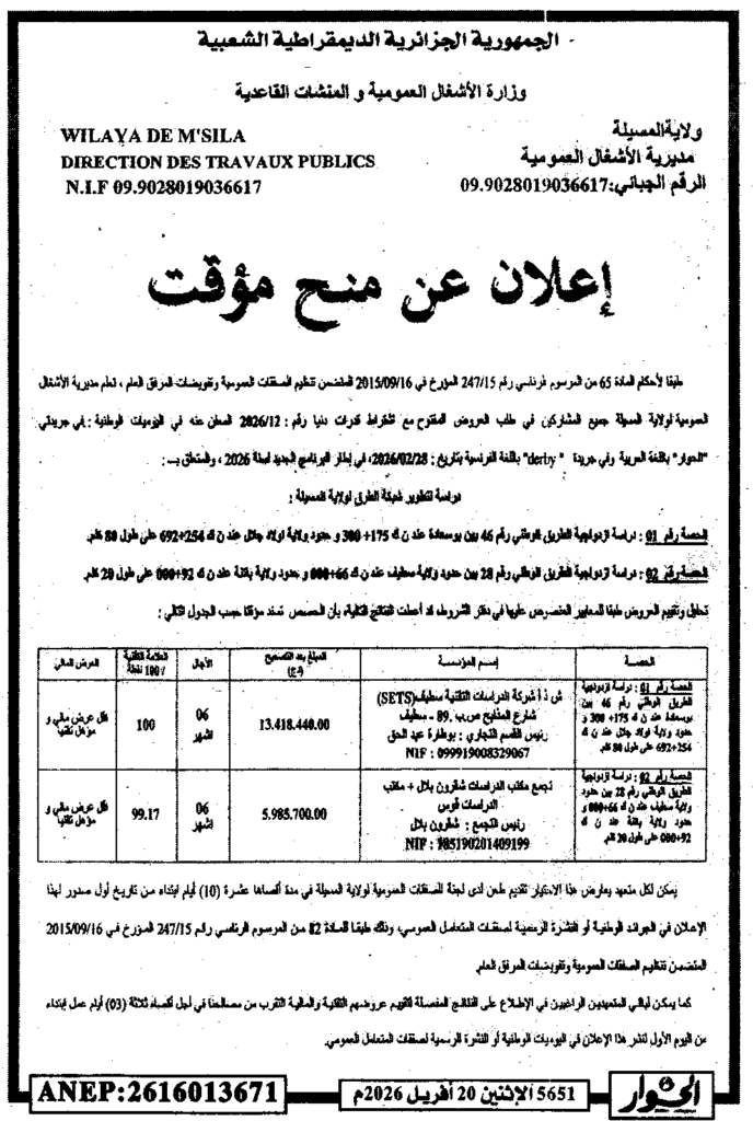 إعلان عن منح مؤقت دراسة لتطويرشبكة الطرق لولاية المسيلة/ مديرية الأشغال العمومية لولاية المسيلة