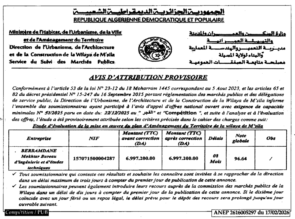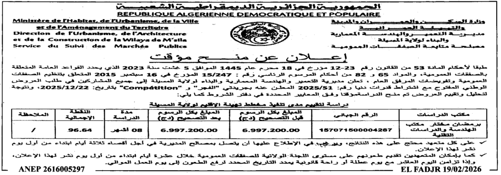 إعلان عن منح مؤقت دراسة لتقييم مدى تنفيذ مخطط تهيئة الاقليم للولاية/ مديرية التعمير والهندسة المعمارية والبناء لولاية المسيلة