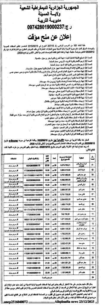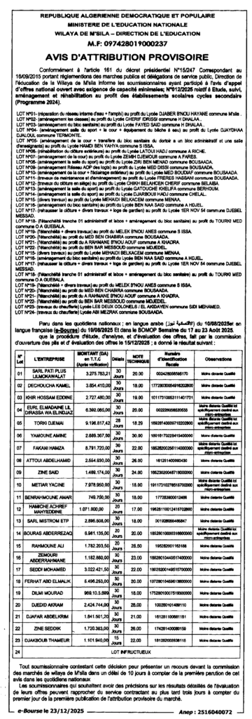 إعلان عن منح مؤقت دراسة متابعة تهيئة وإعادة تأهيل لفائدة المؤسسات المدرسية للطور الثانوي/ مديرية التربية لولاية المسيلة