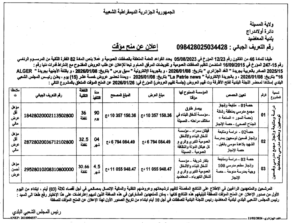 إعلان عن منح مؤقت دراسة متابعة وانجاز مجمع مدرسي وقسمين ومطعم مدرسي/ بلدية المعاضيد