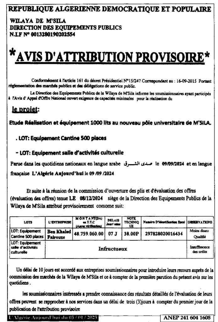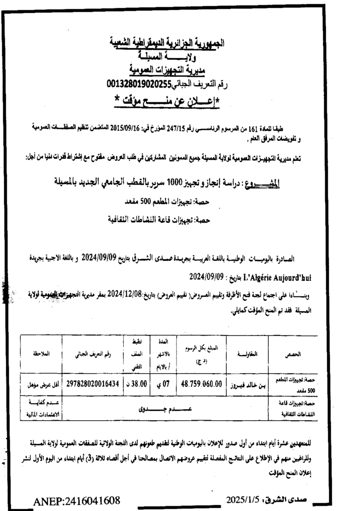 إعلان عن منح مؤقت دراسة وانجاز وتجهيز 1000 سرير بالقطب الجامعي الجديد بالمسيلة/ مديرية التجهيزات العمومية لولاية المسيلة