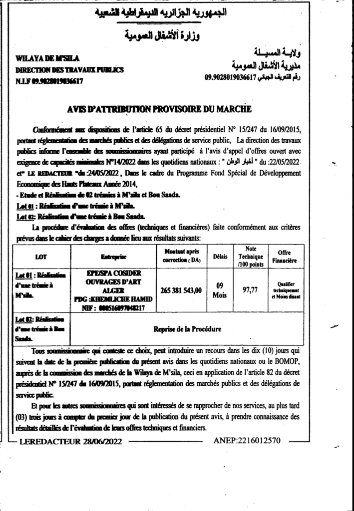 إعلان عن منح مؤقت: دراسة وانجاز معبرين (02) بالمسيلة وبوسعادة مديرية الأشغال العمومية