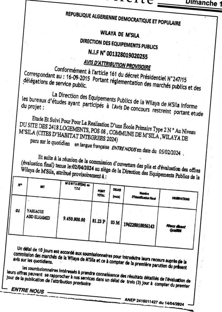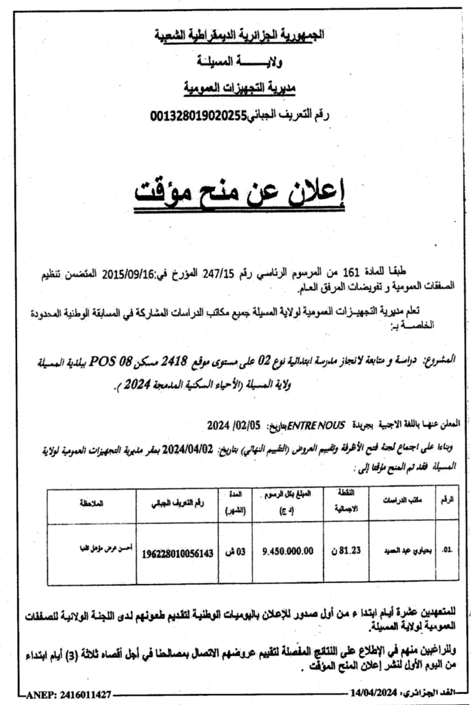 إعلان عن منح مؤقت: دراسة ومتابعة لانجاز مدرسة ابتدائية نوع 02 على مستوى موقع 2418 مسكن POS 08 بلدية المسيلة/ مديرية التجهيزات العمومية لولاية المسيلة