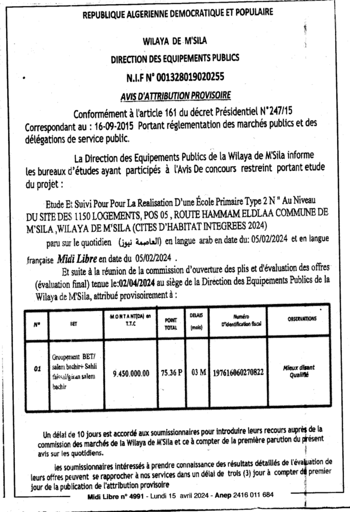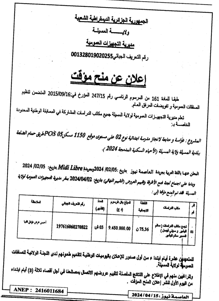 إعلان عن منح مؤقت: دراسة ومتابعة لانجاز مدرسة ابتدائية نوع 02 على مستوى موقع 1150 مسكن POS 05 بلدية طريق حمام الضلعة/ مديرية التجهيزات العمومية لولاية المسيلة