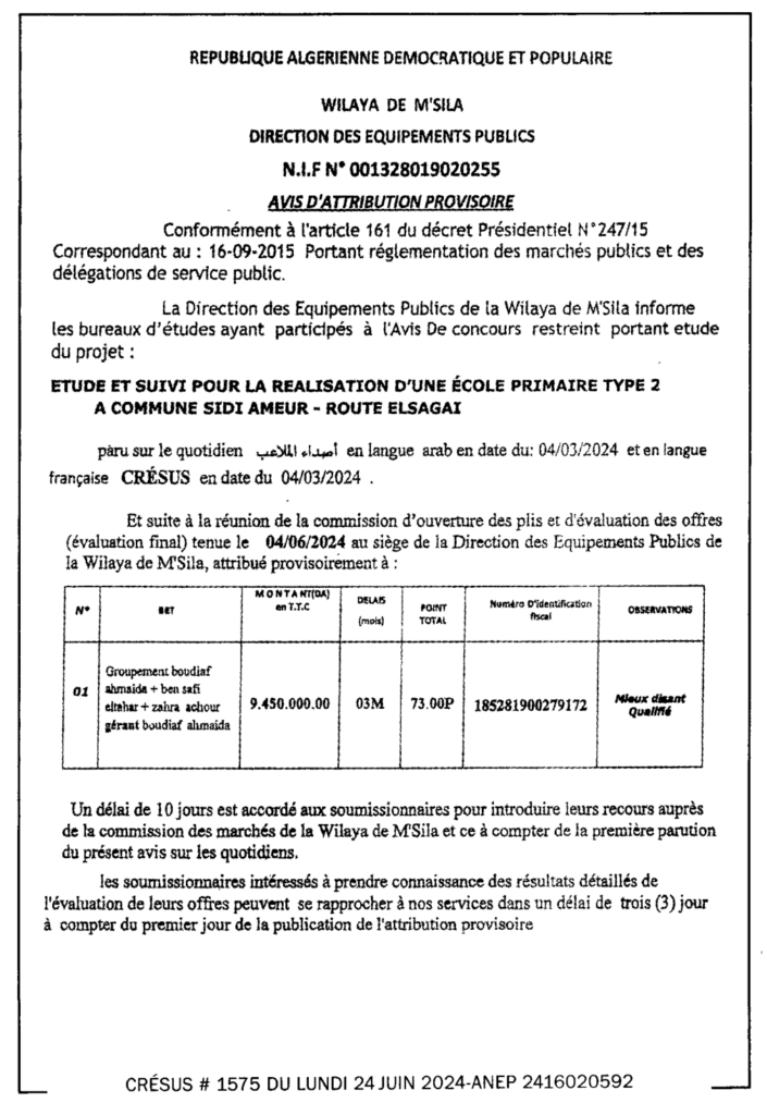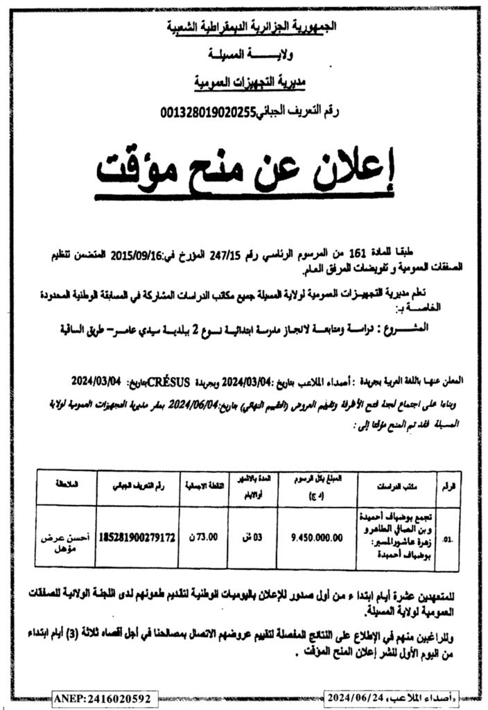 إعلان عن منح مؤقت دراسة ومتابعة لانجاز مدرسة ابتدائية نوع 2 ببلدية سيدي عامر/ مديرية التجهيزات العمومية لولاية المسيلة