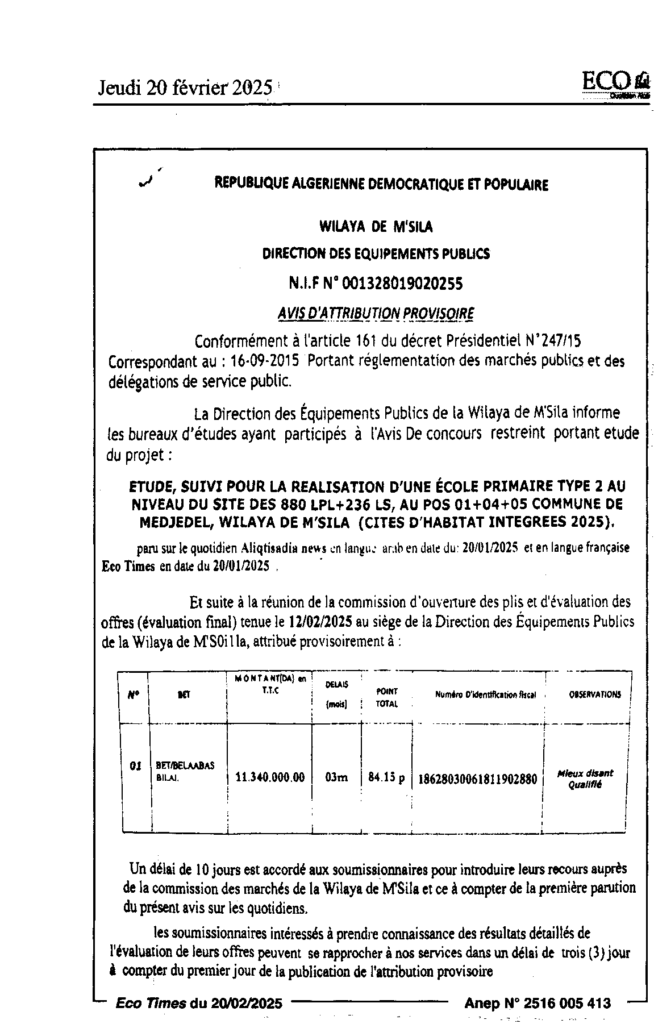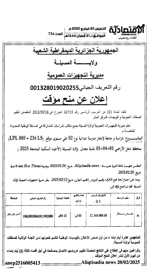 إعلان عن منح مؤقت دراسة ومتابعة لانجاز مدرسة ابتدائية نوع 02 على مستوى موقع (LS 230 + LPL 880) بمخطط شغل الأراضي ببلدية امجدل/ مديرية التجهيزات العمومية لولاية المسيلة