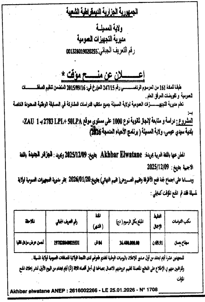 إعلان عن منح مؤقت دراسة ومتابعة لانجاز ثانوية نوع 1000 بلدية سيدي عيسى/ مديرية التجهيزات العمومية لولاية المسيلة