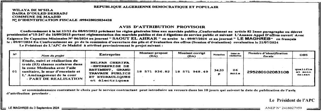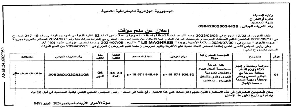 إعلان عن منح مؤقت دراسة ومتابعة وانجاز 03 أقسام بمنطقة مدوحة مع الجناح الصحي وجدار الإحاطة وتهيئة الساحة/ بلدية المعاضيد