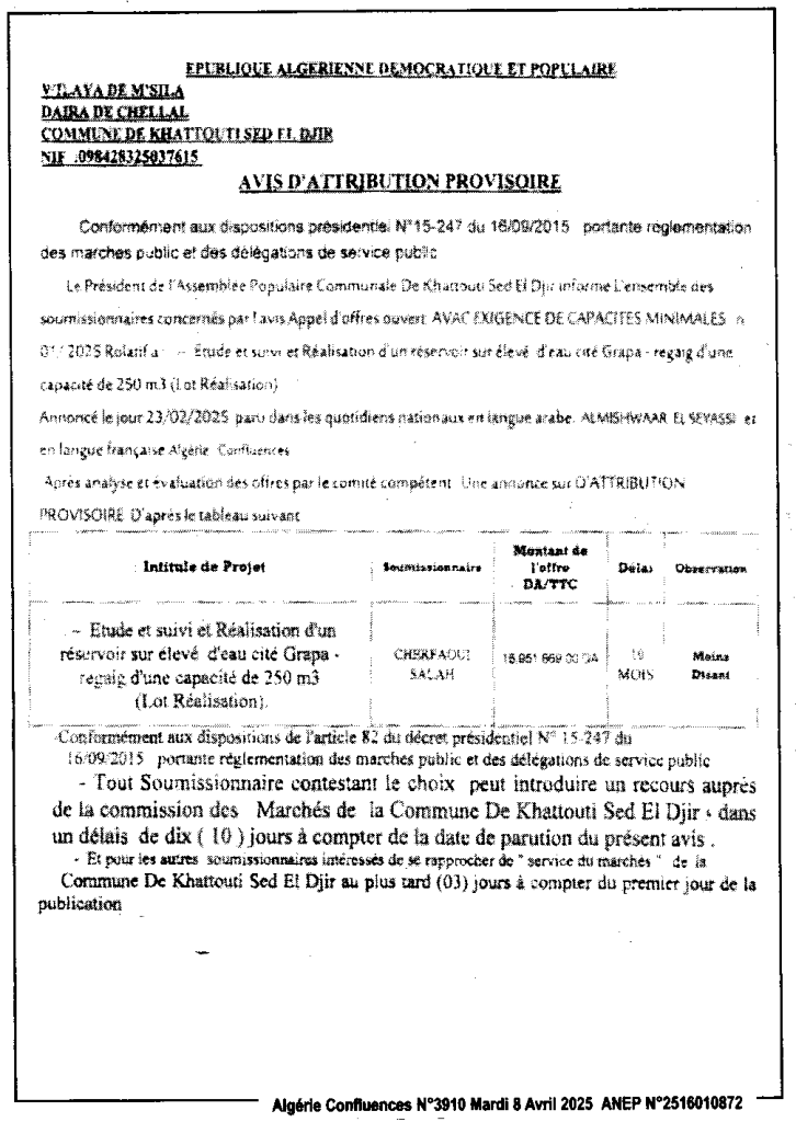 إعلان عن منح مؤقت دراسة ومتابعة وانجاز خزان مائي مرتفع سعته 250 م3 بحي الغرابة-الرقايق (حصة الانجاز)/ بلدية خطوطي سد الجير