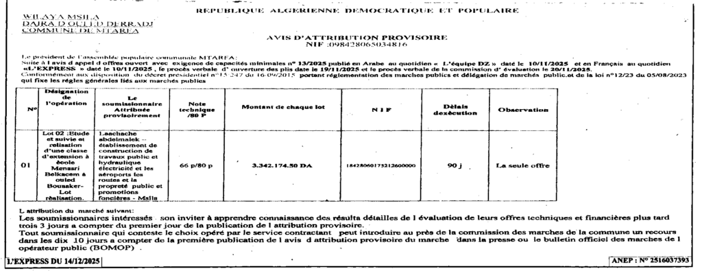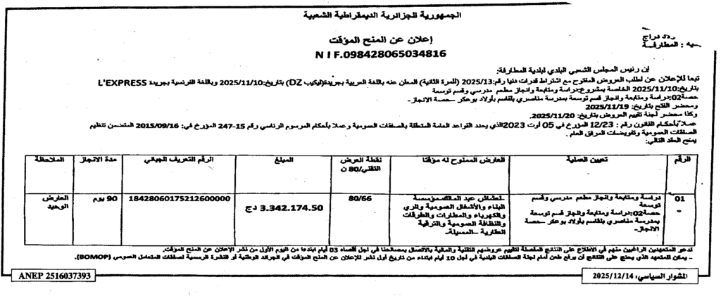 إعلان عن منح مؤقت دراسة ومتابعة وانجاز مطعم مدرسي وقسم توسعة/ بلدية المطارفة