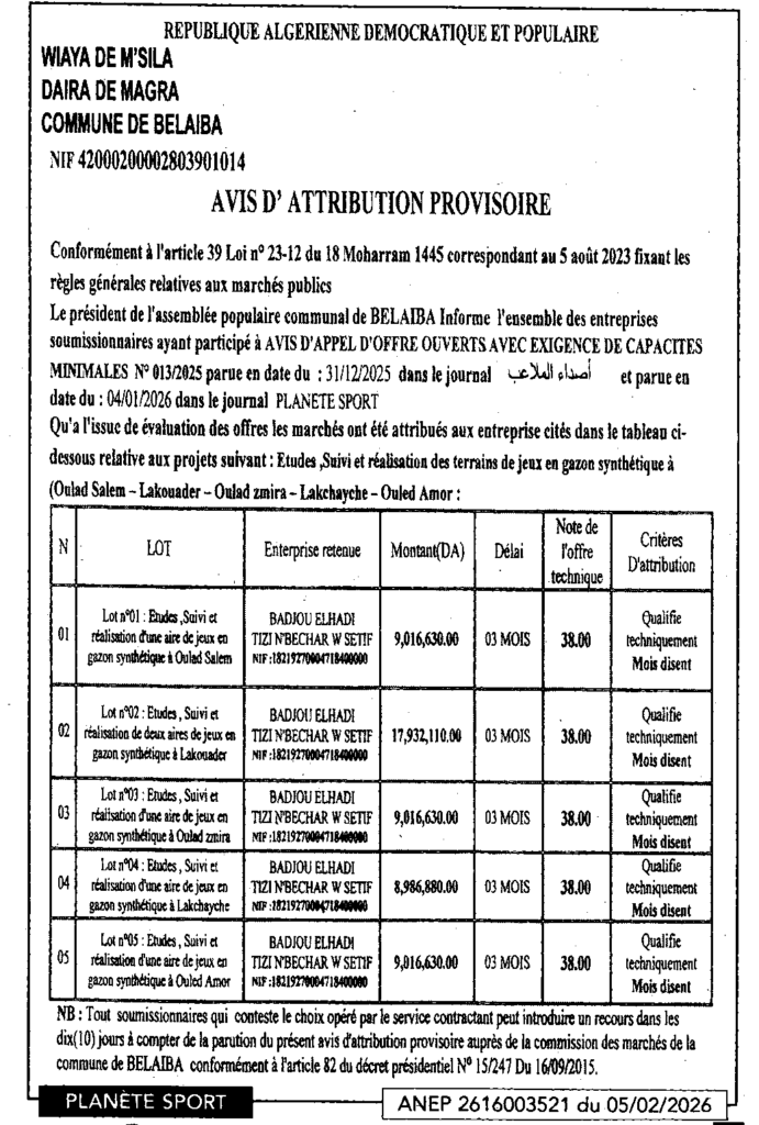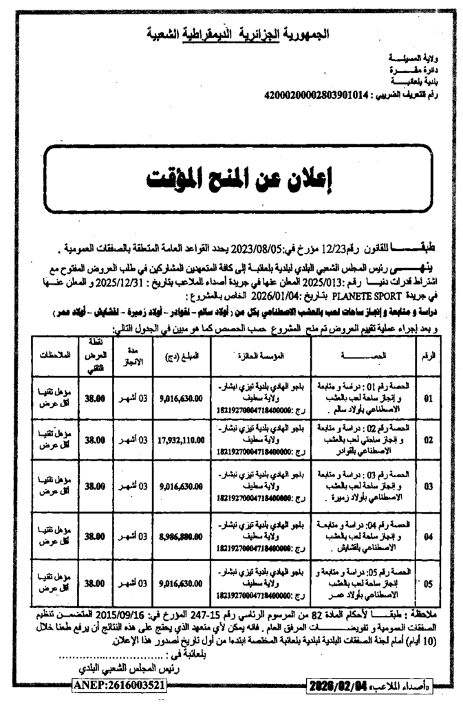 إعلان عن منح مؤقت دراسة ومتابعة وانجاز ساحة اللعب بالعشب الاصطناعي/ بلدية بلعايبة