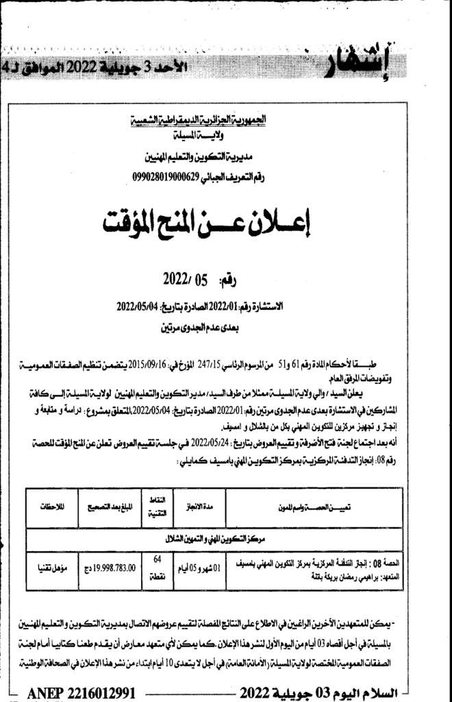 إعلان عن منح مؤقت: دراسة ومتابعة وانجاز وتجهيز مركزين للتكوين المهني بكل من الشلال وامسيف / مديرية التكوين والتعليم المهنيين