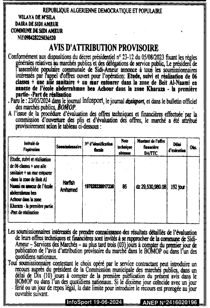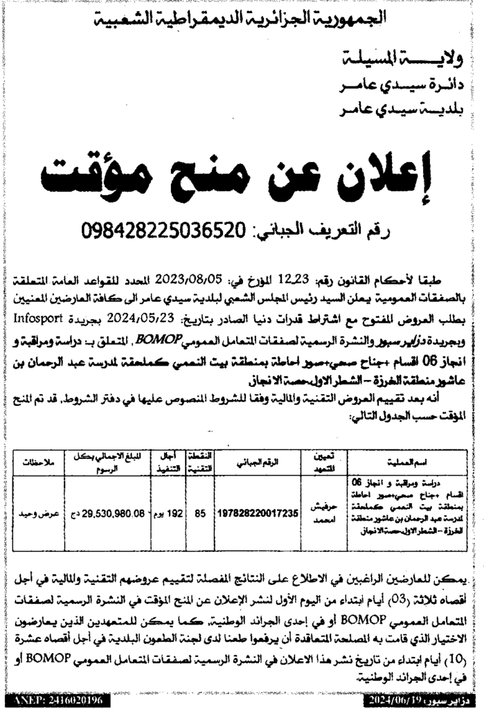 إعلان عن منح مؤقت دراسة ومراقبة وانجاز 06 أقسام + جناح صحي + سور احاطة + بمنطقة بيت النعمي كملحقة لمدرسة عبد الرحمان بن عاشور منطقة الخرزة/ بلدية سيدي عامر