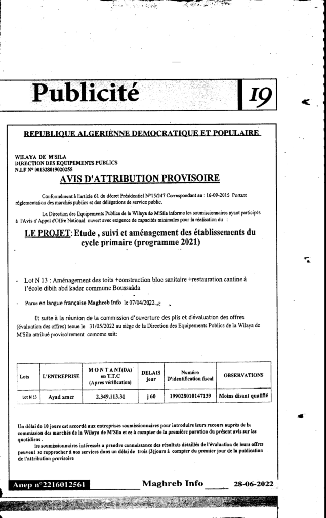 إعلان عن منح مؤقت: دراسة ومراقبة وتطوير المدارس الإبتدائية (برنامج 2021) مديرية التجهيزات العمومية