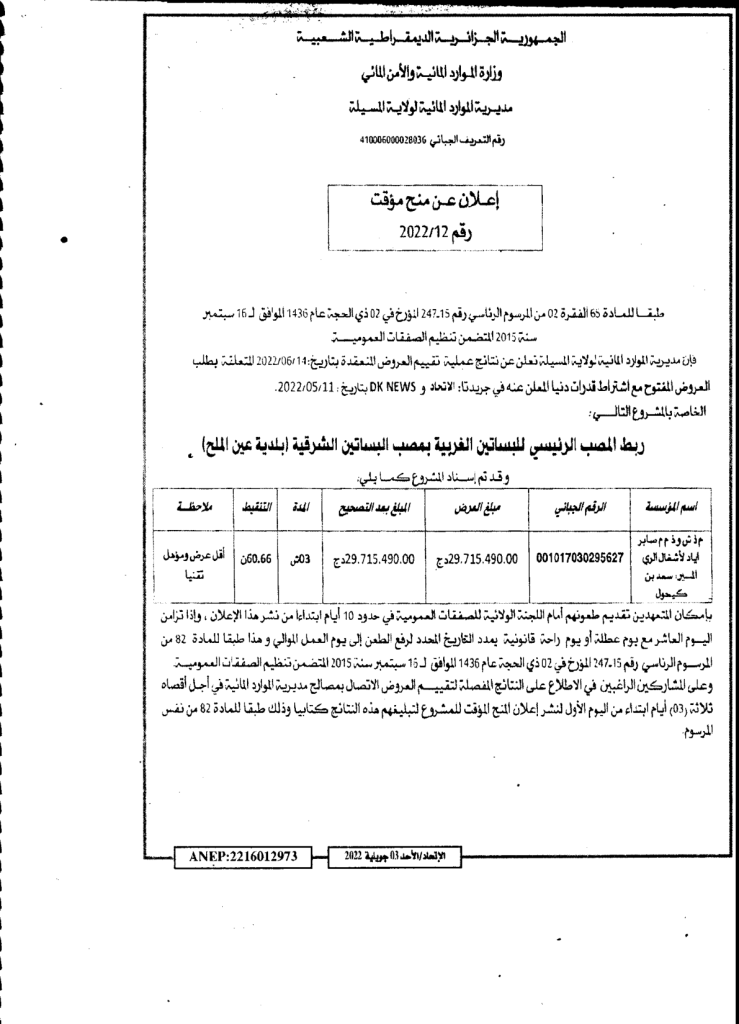 إعلان عن منح مؤقت: ربط المصب الرئيسي للبساتين الغربية بمصب البساتين الشرقية (بلدية عين الملح) مديرية الموارد المائية