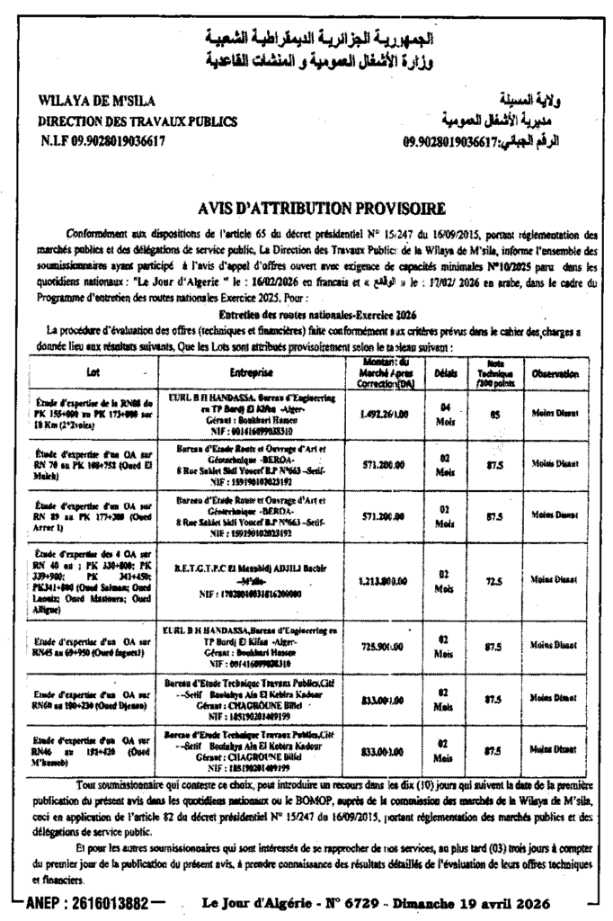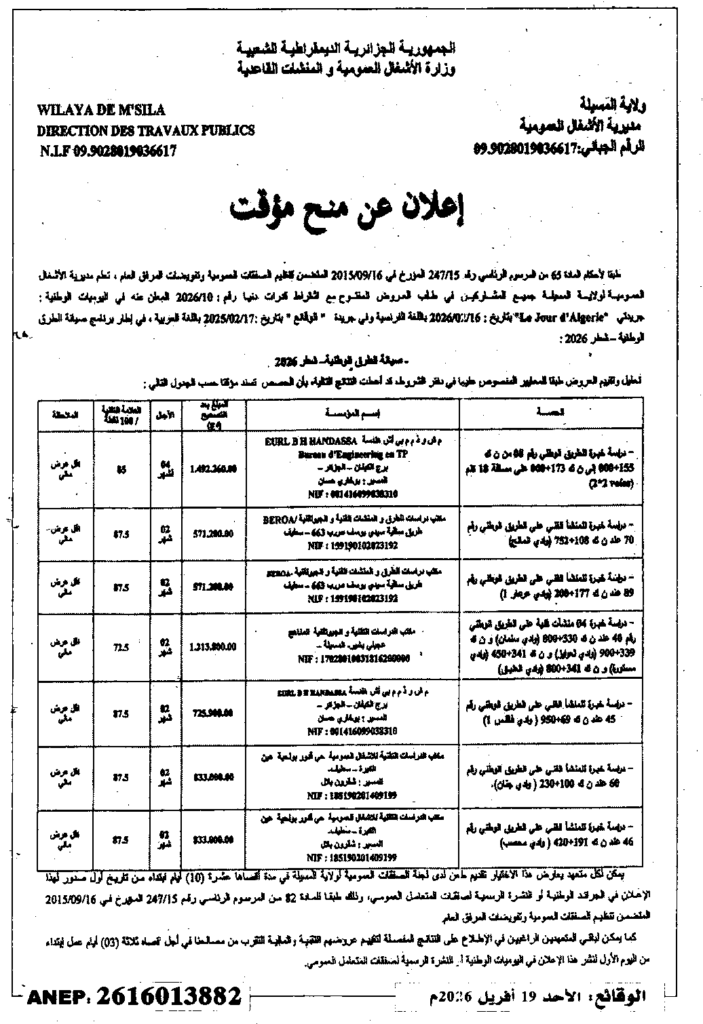 إعلان عن منح مؤقت صيانة الطرق الوطنية شطر 2026/ مديرية الأشغال العمومية لولاية المسيلة