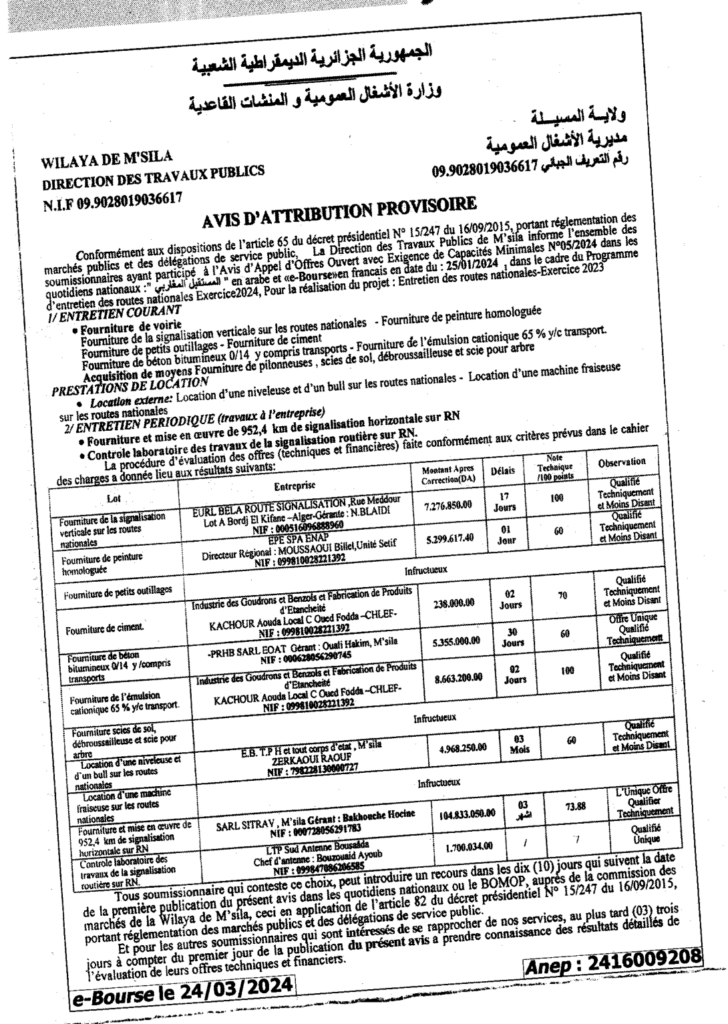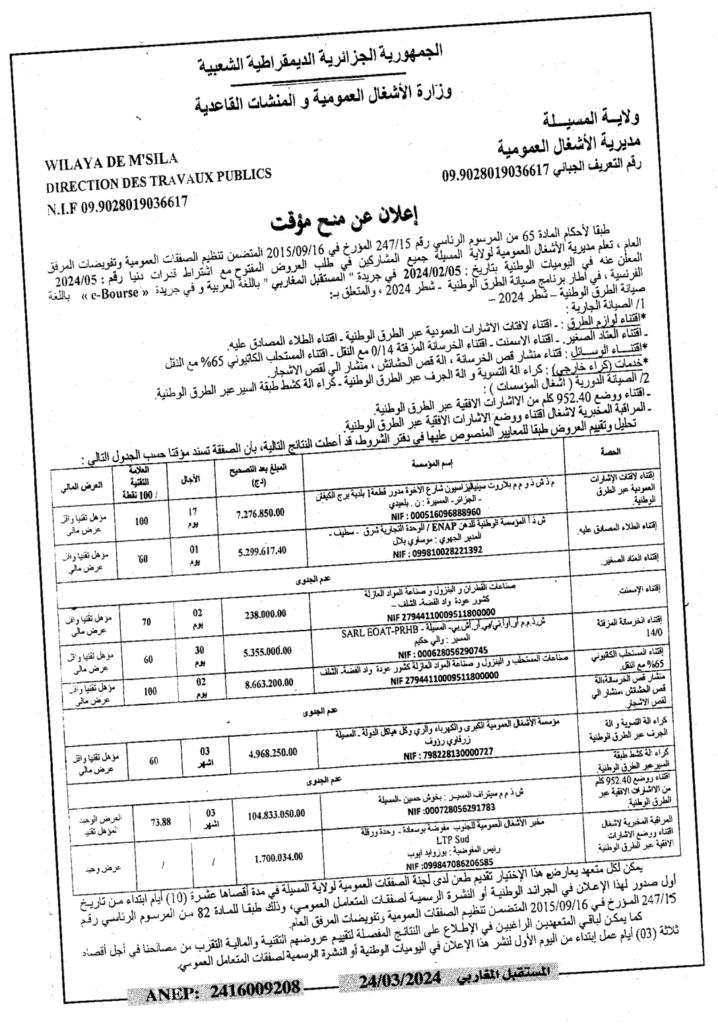 إعلان عن منح مؤقت: صيانة الطرق الوطنية -شطر 2024-/ مديرية الأشغال العمومية لولاية المسيلة
