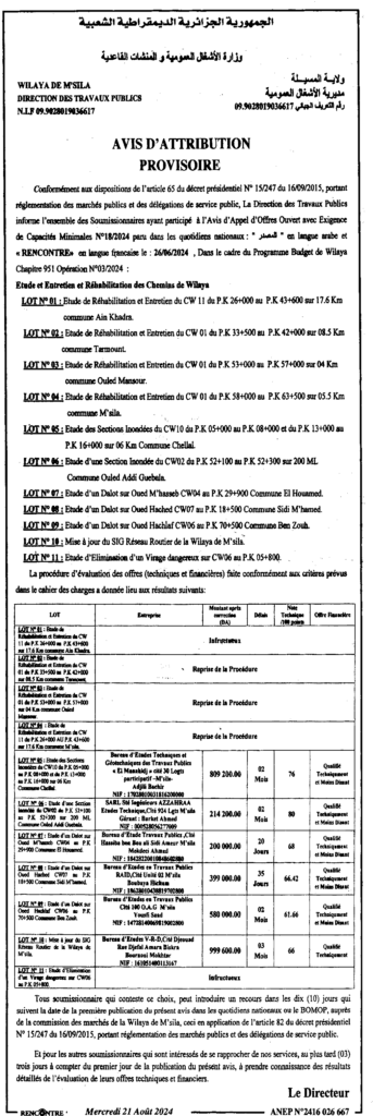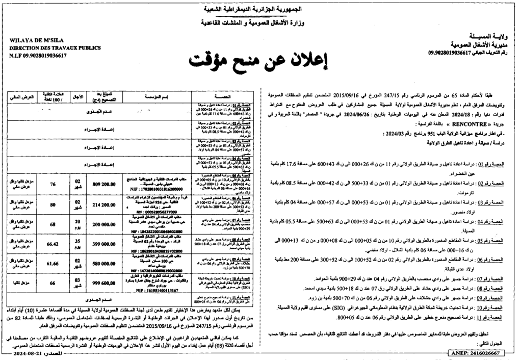 إعلان عن منح مؤقت صيانة وإعادة تأهيل طرق الولاية/ مديرية الأشغال العمومية لولاية المسيلة