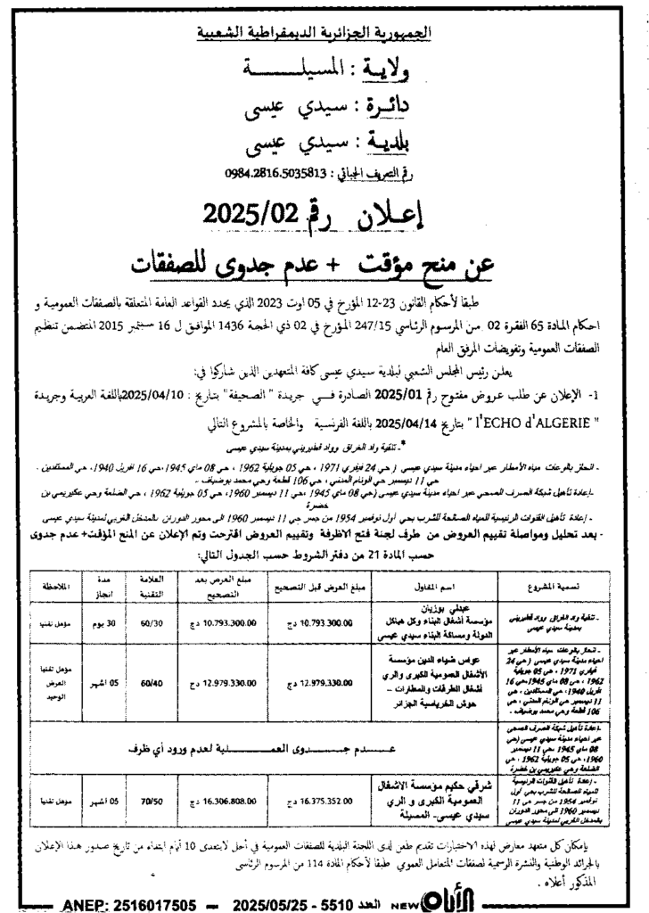 تنقية واد الغراق وواد قطيريني بمدينة سيدي عيسى25 مايو، 20250 21 شاركها فيسبوك X مشاركة عبر البريد طباعة