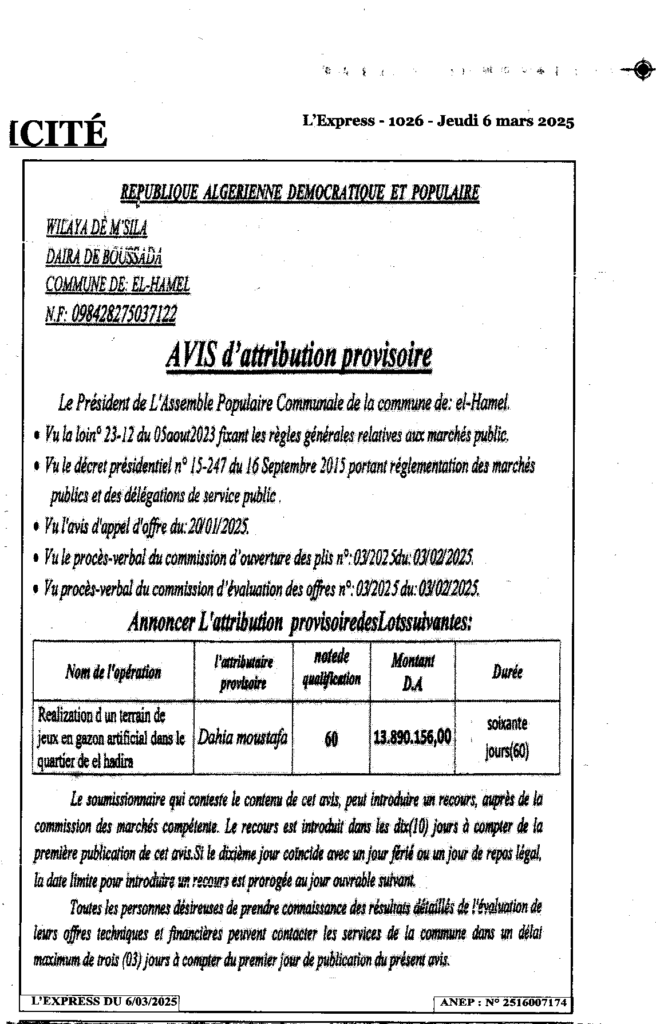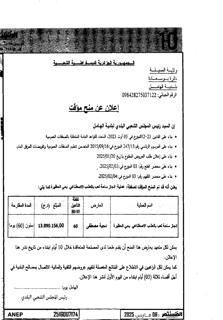 إعلان عن منح مؤقت عملية انجاز ساحة لعب بالعشب الاصطناعي بحي الحظيرة/ بلدية الهامل