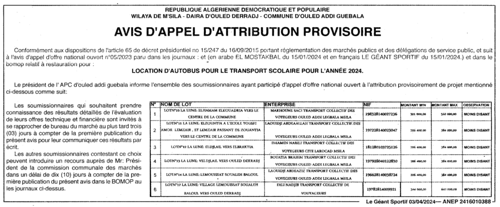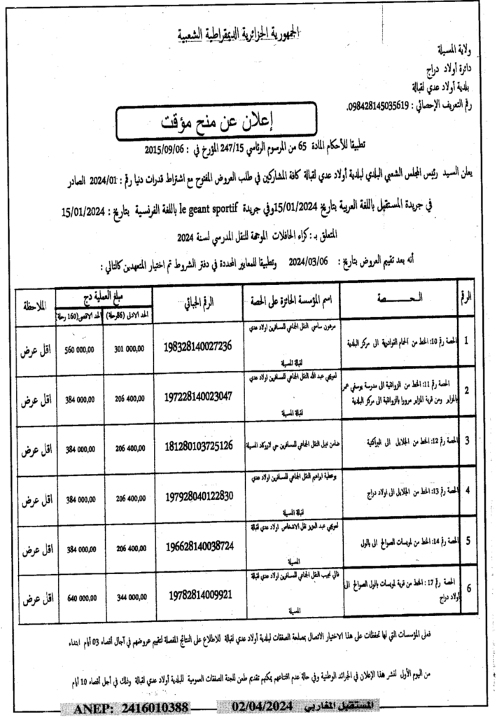 إعلان عن منح مؤقت: كراء الحافلات الموجهة للنقل المدرسي لسنة 2024/ بلدية أولاد عدي لقبالة
