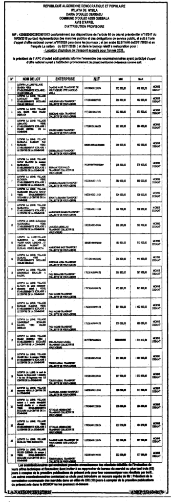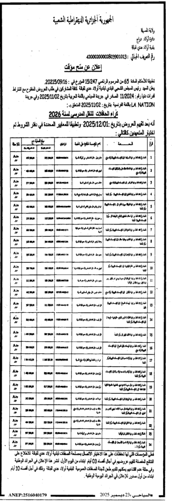إعلان عن منح مؤقت كراء الحافلات للنقل المدرسي 2026/ بلدية أولاد عدي لقبالة