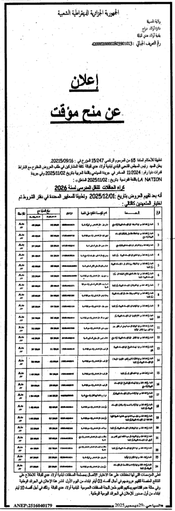 إعلان عن منح مؤقت كراء الحافلات للنقل المدرسي 2026/ بلدية أولاد عدي لقبالة
