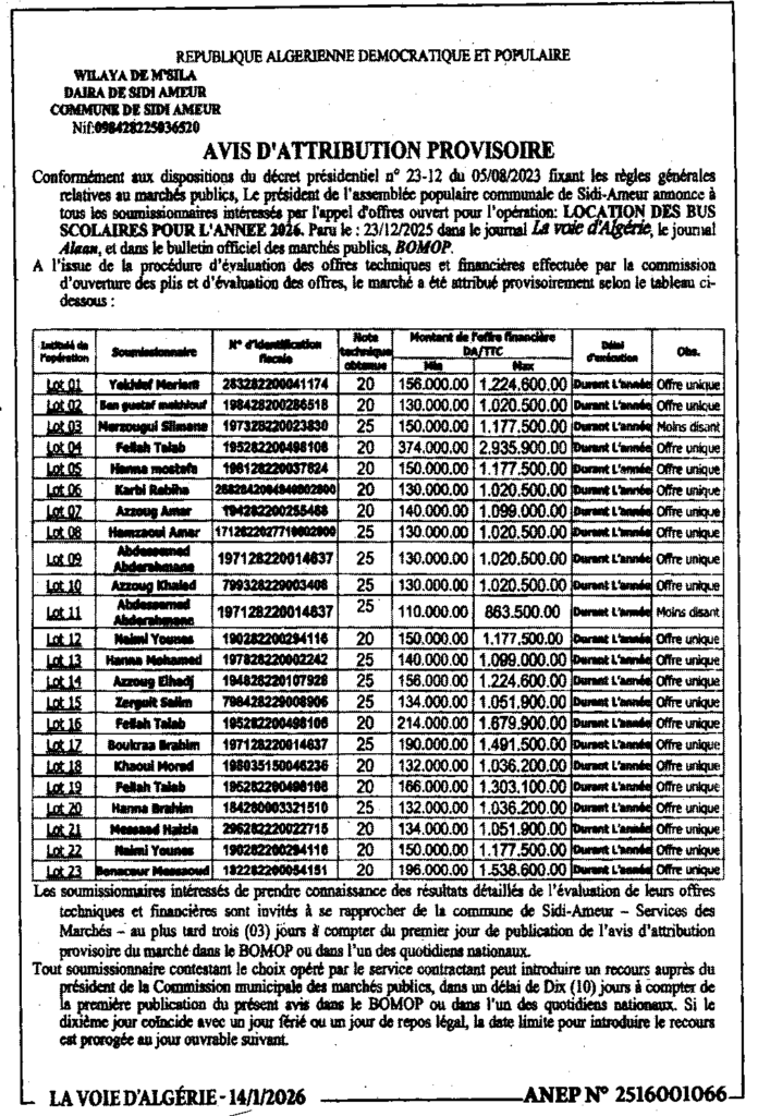 إعلان عن منح مؤقت كراء حافلات النقل المدرسي لسنة 2026/ بلدية سيدي عامر