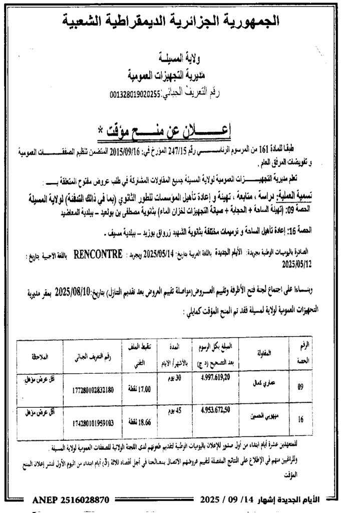 إعلان عن منح مؤقت لدراسة متابعة تهيئة وإعادة تأهيل المؤسسات للطور الثانوي/ مديرية التجهيزات العمومية لولاية المسيلة