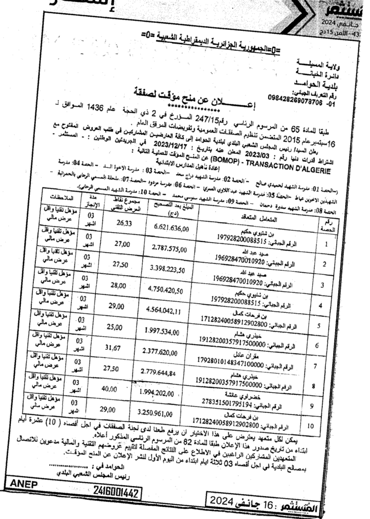 إعلان عن منح مؤقت لصفقة: إعادة تأهيل المدارس الابتدائية/ بلدية الحوامد