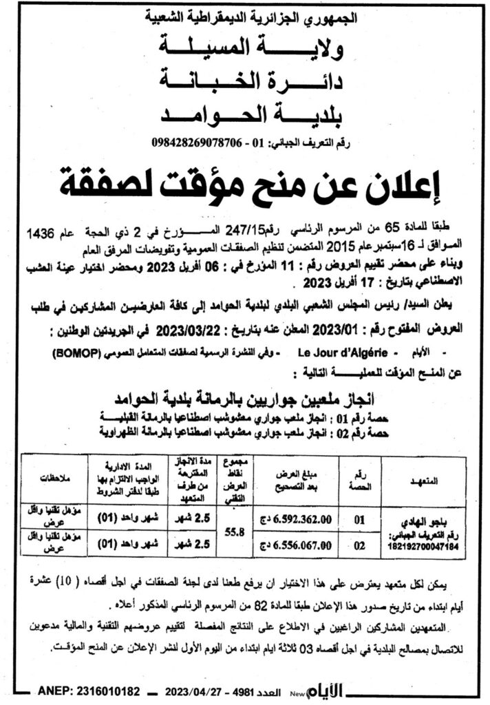 إعلان عن منح مؤقت لصفقة إنجاز ملعبين جواريين بالرمانة بلدية الحوامد