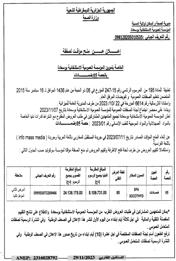 إعلان عن منح مؤقت لصفقة الخاصة بتموين المؤسسة العمومية الاستشفائية ببوسعادة بالحصة: 05 ضمادات