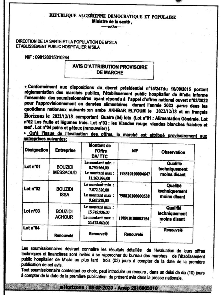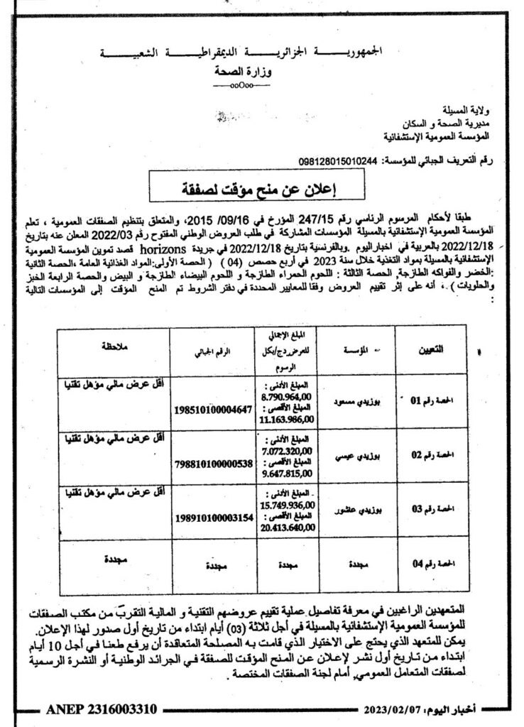 إعلان عن منح مؤقت لصفقة/ المؤسسة العمومية الاستشفائية المسيلة