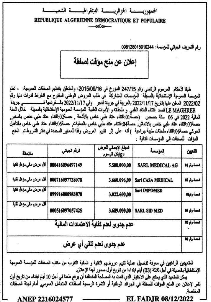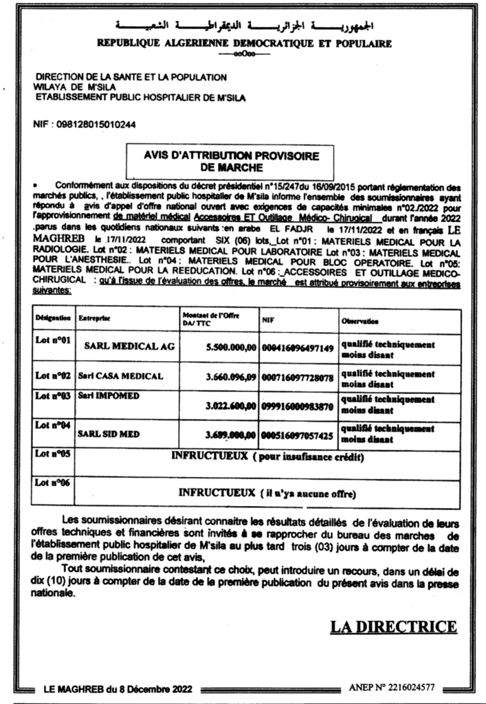 إعلان عن منح مؤقت لصفقة/ المؤسسة العمومية الاستشفائية بالمسيلة